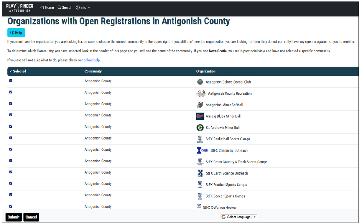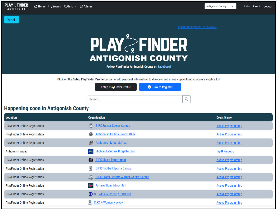 Antigonish, Nova Scotia is one of our most active implementations and demonstrates how multiple organizations, facilities, and opportunities are connected within a shared PlayFinder environment.